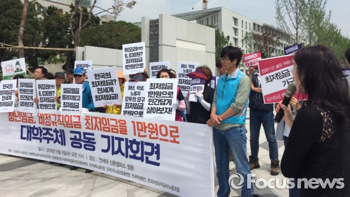 청소노동자, 시간강사 등 대학교 내 비정규직 노동자들과 청년들은 8일 오전 서울 서대문구 신촌에 위치한 연세대학교 정문 앞에서 기자회견을 열고 최저임금 인상에 대한 목소리를 높였다.