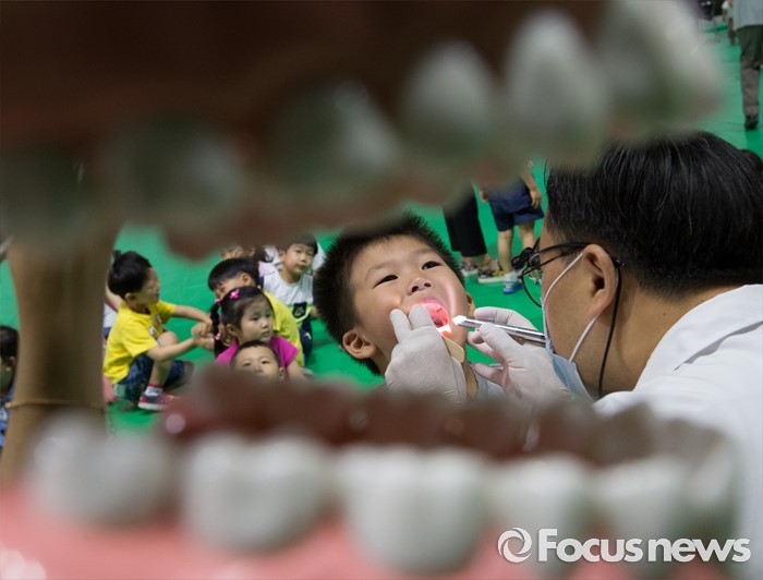 (대전=포커스뉴스) 9일 오전 구강보건의 날을 맞아 대전치과의사회 소속 치과의사들이 대전 서구 대전과학기술대학교에서 어린이집과 유치원 아동 5000여 명을 대상으로 무료 구강검진을 하고 있다.