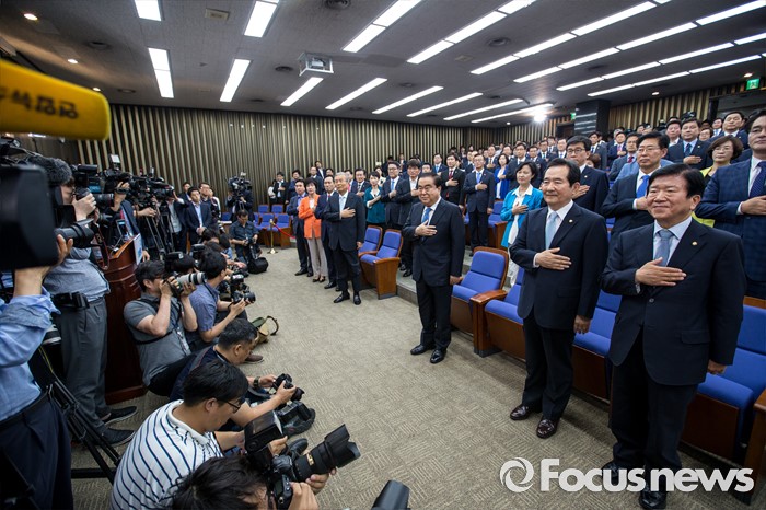 (서울=포커스뉴스) 9일 오전 서울 여의도 국회에서 열린 의원총회에 참석한 국회의장 후보들이 국민의례를 하고 있다. 오른쪽부터 박병석 의원, 정세균 의원, 문희상 의원.
