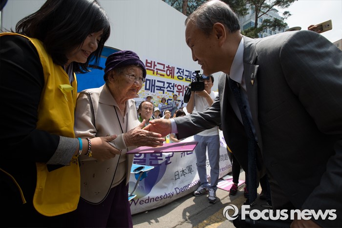 (서울=포커스뉴스) 8일 오후 서울 종로구 옛 일본대사관 앞에서 열린 제 1234차 일본군 위안부 문제해결을 위한 정기 수요시위에 참가한 한국기독교장로회총회에서 정의기억재단 후원금을 길원옥 할머니께 전달하고 있다.