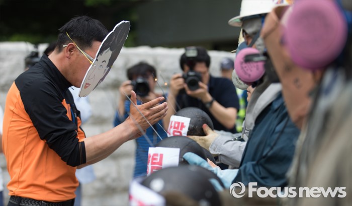(서울=포커스뉴스) 8일 오전 서울 여의도 국회 앞에서 민주노총 금속노조 조합원들와 조선소 하청업체 직원들이 구조조정 중단과 고용안전 대책을 요구하는 퍼포먼스를 하고 있다.