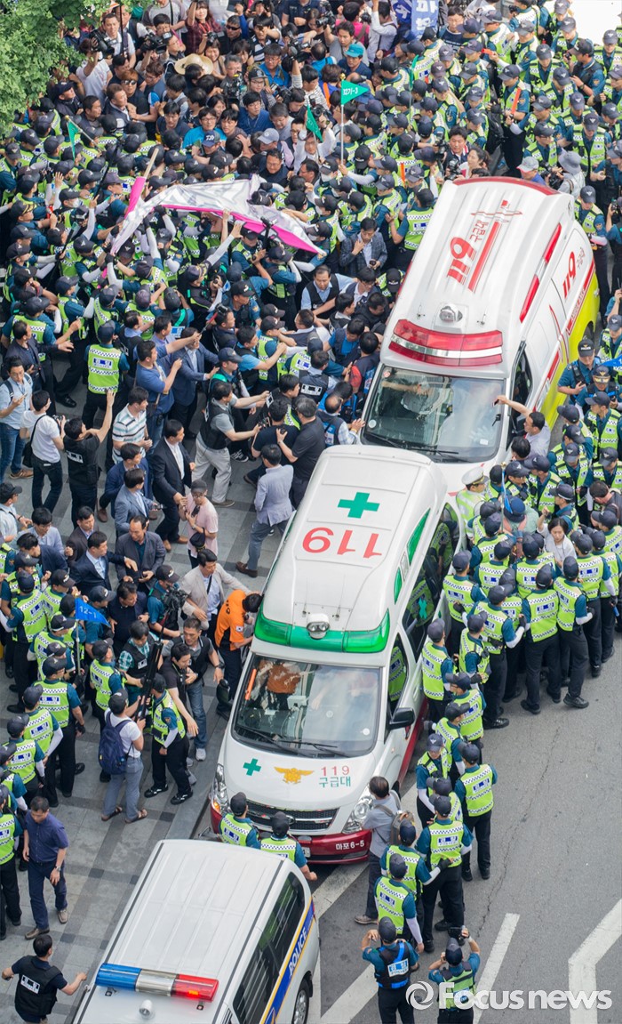 (서울=포커스뉴스) 8일 오후 서울 을지로 옛 국가인권위원회 옥상 광고탑에서 기아자동차 비정규직 노동자의 정규직화를 요구하며 363일 동안 고공농성을 벌인 한규협(위쪽)씨와 최정명씨가 경찰에 의해 구급차로 끌려가고 있다.