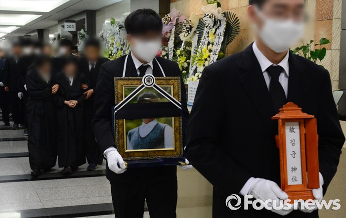 (서울=포커스뉴스) 서울 지하철 2호선 구의역에서 스크린도어를 정비하다가 숨진 김 모 군의 발인일인 9일 오전 서울 광진구 건국대학교병원 장례식장에서 유족들이 고인의 영정을 따르며 슬퍼하고 있다.