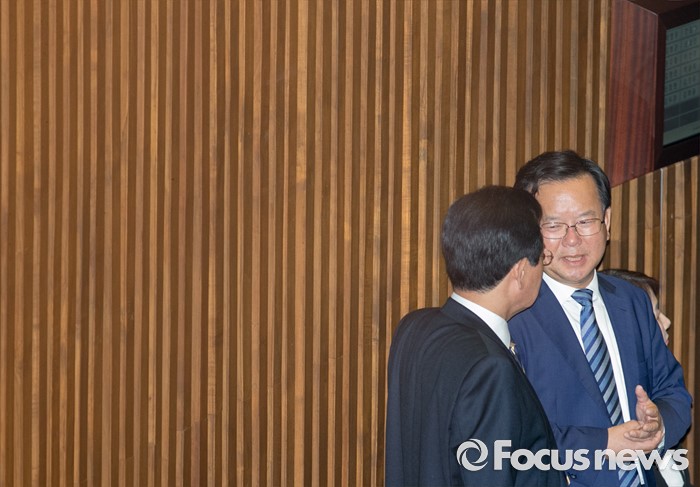(서울=포커스뉴스) 9일 오후 서울 여의도 국회에서 열린 20대 국회 첫 본회의에 참석한 변재일(왼쪽) 더불어민주당 정책위의장과 김부겸 의원이 대화하고 있다.
