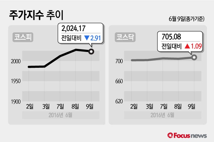 (서울=포커스뉴스) 9일 코스피지수는 전날 보다 0.14%(2.91포인트) 내린 2,024.17에 장을 마쳤다. 코스닥지수는 전일 대비 0.15%(1.09포인트) 오른 705.08에 마감했다.