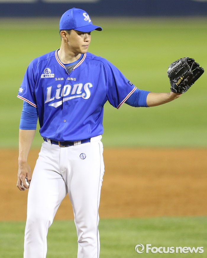(서울=포커스뉴스) 8일 서울 잠실구장에서 열린 2016 프로야구 삼성-LG 경기 4회말 무사 1루에서 삼성 투수 장필준이 투구에 자신의 맞고 진루한 LG 히메네스에게 사과의 사인을 보내고 있다.