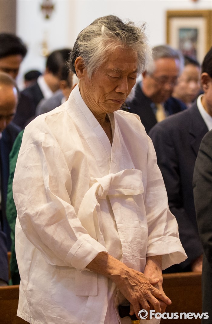 (서울=포커스뉴스) 10일 오전 서울 중구 정동 대한성공회 서울주교좌성당에서 열린 6월항쟁 29주년 기념식에 참석한 백기완 통일문제연구소장이 기도하고 있다.