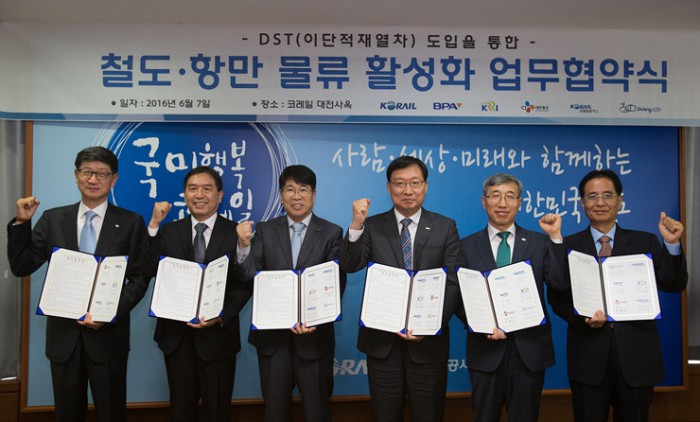 한국철도공사(이하 코레일)은 지난 7일 대전 사옥에서 부산항만공사, 한국철도기술연구원, CJ대한통운, 코레일로지스, 의왕ICD 등 6개 기관과 'DST 도입을 통한 철도와 항만의 물류 활성화'를 위한 업무협약(MOU)를 체결했다고 8일 밝혔다.