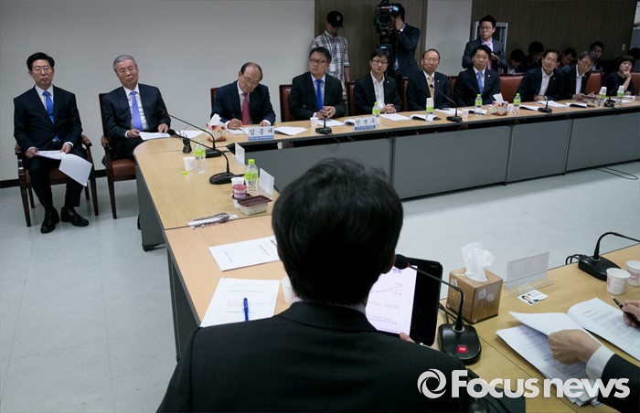 (서울=포커스뉴스) 8일 오전 서울 여의도 민주정책연구원에서 '건강보험 부과체계 개편 방안' 주제로 열린 사회경제포럼에 참석한 양승조(왼쪽부터) 더불어민주당 의원, 김종인 비대위 대표, 김종대 정책위부의장, 민병두 민주정책연구원장이 이진석 서울대 의대 교수의 발제를 듣고 있다.