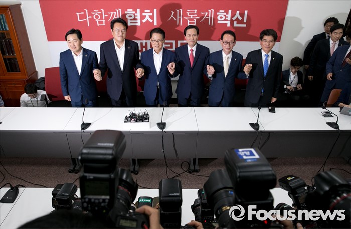 (서울=포커스뉴스) 8일 오후 서울 여의도 국회 새누리당 원내대표실에서 20대 국회 원구성 협상 등을 위한 3당 원내지도부 회동에 참석한 의원들이 포즈를 취하고 있다. 오른쪽부터 박완주 더불어민주당 원내수석부대표, 김도읍 새누리당 원내수석부대표, 우상호 더불어민주당 원내대표, 박지원 국민의당 원내대표, 정진석 새누리당 원내대표, 김관영 국민의당 원내수석부대표.