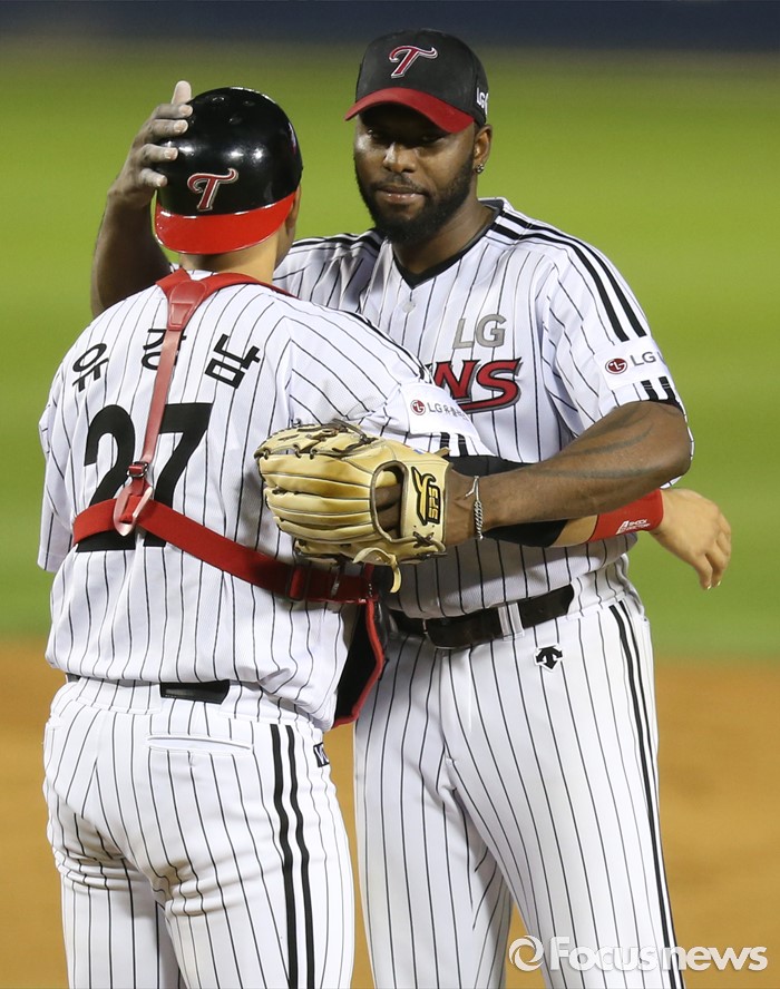 (서울=포커스뉴스) 9일 서울 잠실구장에서 열린 2016 프로야구 삼성-LG 경기에서 LG 투수 헨리 소사가 8회 1사후 안타를 맞고 투수교체를 기다리며 포수 유강남과 포옹하고 있다.