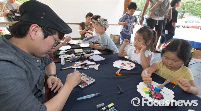 (서울=포커스뉴스) 9일 오후 단오 세시풍속을 체험하기 위해 서울 중구 남산 한옥마을을 방문한 어린 아이들이 부채 만들기 체험을 하고 있다.