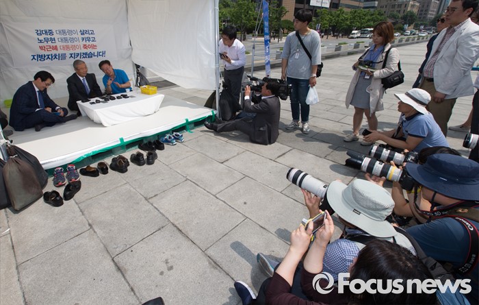 (서울=포커스뉴스) 김종인(왼쪽) 더불어민주당 비상대책위원회 대표가 8일 오후 서울 광화문광장에서 지방재정제도 개편을 반대하며 무기한 단식농성 중인 이재명 성남시장을 만나 대화하고 있다.