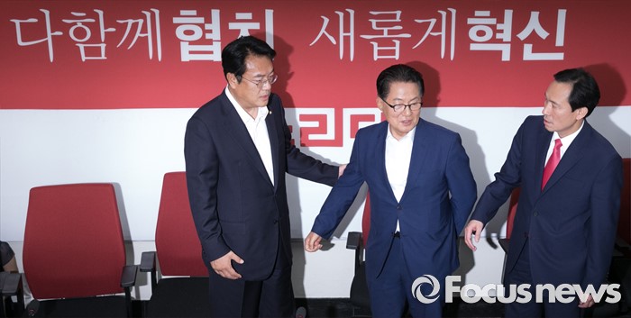 (서울=포커스뉴스) 8일 오후 서울 여의도 국회 새누리당 원내대표실에서 진행된 20대 국회 원구성 협상 등을 위한 3당 원내지도부 회동에 원내대표들이 참석하고 있다. 왼쪽부터 정진석 새누리당 원내대표, 박지원 국민의당 원내대표, 우상호 더불어민주당 원내대표.