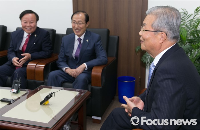 (서울=포커스뉴스) 김종인(오른쪽) 더불어민주당 비대위 대표가 10일 오후 서울 여의도 국회를 방문한 이원종(가운데) 대통령비서실장, 김재원 청와대 정무수석과 면담을 하고 있다.