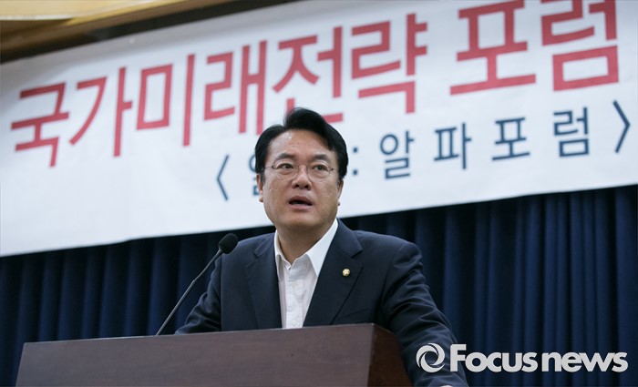 (서울=포커스뉴스) 8일 오전 서울 여의도 국회 의원회관에서 열린 국가미래전략포럼(일명 알파포럼) 창립총회 및 강연회에 참석한 정진석 새누리당 원내대표가 축사를 하고 있다. 이날 정 원내대표와 서 전 최고위원은 국회의장직을 야당에 양보한다는 뜻을 밝혔다.