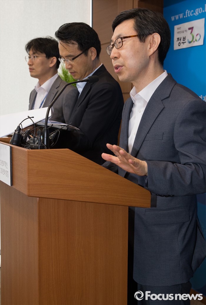 (세종=포커스뉴스) 신영선 공정거래위원회 사무처장이 8일 오전 세종시 정부세종청사 공정위 기자실에서 대기업집단 지정제도 개선방안에 대한 브리핑을 하고 있다. 오른쪽부터 신영선 사무총장, 박춘호 기획재정부 법인세제과장. 이병원 기획재정부 기업환경과장.