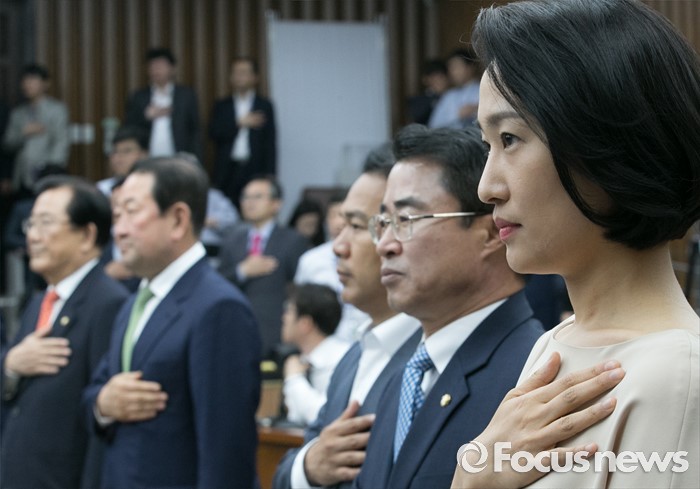 (서울=포커스뉴스) 9일 오전 서울 여의도 국회에서 국회 부의장 후보 선출을 위해 열린 국민의당 의원총회에 참석한 김수민(오른쪽) 의원이 국기에 대한 경례를 하고 있다. 김 의원은 20대 총선 당시 선거 홍보물 제작업체 등에 일감을 주고 업체들로부터 억대의 리베이트를 받은 혐의(정치자금법 위반) 등으로 중앙선거관리위원회로부터 고발당한 것으로 전해졌다.