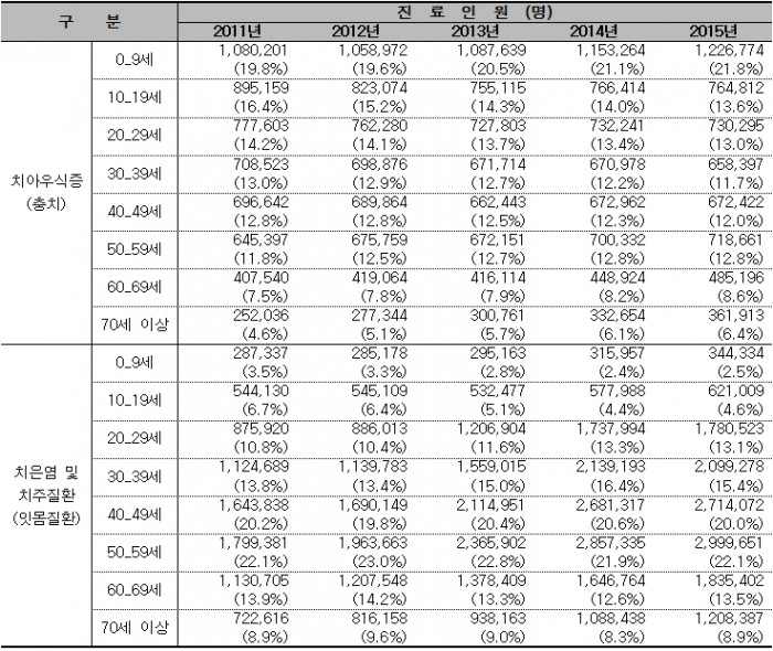 10일 건강보험심사평가원(이하 심사평가원)이 충치(치아우식증) 및 잇몸질환(치은염 및 치주질환)에 대한 최근 5년간(2011년~2015년) 심사결정자료(건강보험 및 의료급여)를 분석한 결과 이같이 조사됐다.