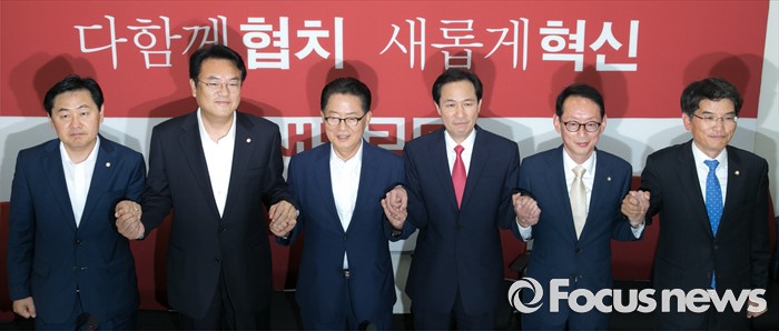 (서울=포커스뉴스) 8일 오후 서울 여의도 국회 새누리당 원내대표실에서 20대 국회 원구성 협상 등을 위한 3당 원내지도부 회동에 참석한 의원들이 포즈를 취하고 있다. 오른쪽부터 박완주 더불어민주당 원내수석부대표, 김도읍 새누리당 원내수석부대표, 우상호 더불어민주당 원내대표, 박지원 국민의당 원내대표, 정진석 새누리당 원내대표, 김관영 국민의당 원내수석부대표.
