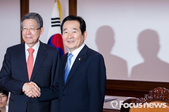 (서울=포커스뉴스) 정세균(오른쪽) 국회의장이 10일 오후 서울 여의도 국회에서 김희옥 새누리당 혁신비상대책위원회 위원장과 면담에 앞서 악수 하고 있다.