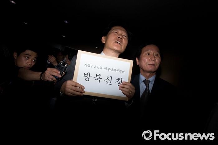 (서울=포커스뉴스) 8일 오전 서울 종로구 정부서울청사 앞에서 정기섭(오른쪽) 개성공단기업 비상대책위원회 위원과 관계자들이 통일부에 방북 신청서를 제출하고 있다.