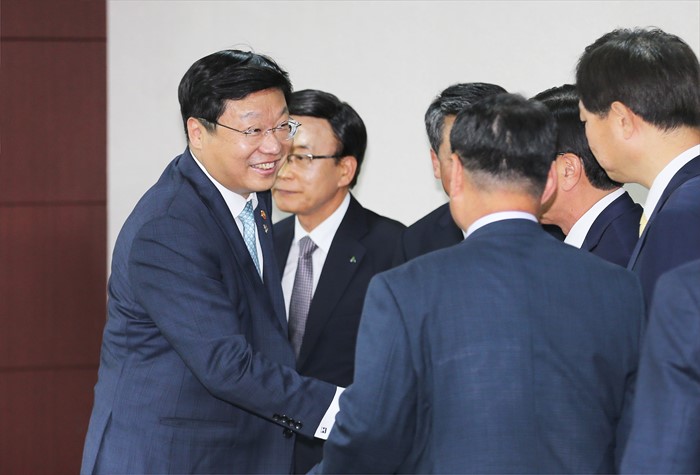 (서울=포커스뉴스) 주형환 산업통상자원부 장관이 8일 오후 서울 무역보험공사 대회의실에서 플랜트 업계 CEO 간담회에서 참석자들과 악수를 하고 있다. 이날 간담회에는 최광철 플랜트협회장(SK건설 대표), 임병용 GS건설 대표, 박증흠 삼성엔지니어링 대표, 박정환 포스코엔지니어링 대표, 최광호 한화건설 대표, 정수현 현대건설 대표, 강영국 대림산업 대표, 홍기표 대우건설 부사장, 김헌탁 두산중공업 부사장, 조용두 포스코건설 본부장, 김영학 무역보험공사 사장, 최성환 수출입은행 부행장, 염동관 플랜트산업협회 부회장이 참석했다. <사진제공=산업통상자원부>