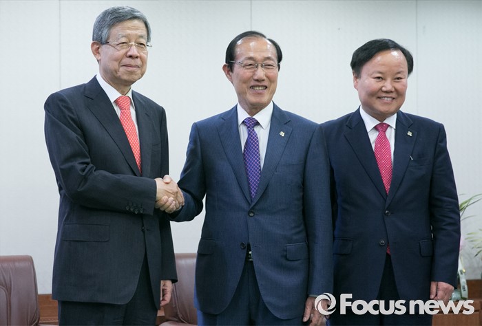 (서울=포커스뉴스) 김희옥(왼쪽) 새누리당 혁신비대위원장이 10일 오후 서울 여의도 당사를 방문한 이원종(가운데) 대통령비서실장, 김재원 청와대 정무수석과 면담에 앞서 인사하고 있다.