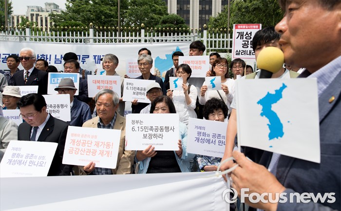 (서울=포커스뉴스) 8일 오전 서울 종로구 정부서울청사 앞에서 615공동선언실천 남측위원회가 6.15공동선언발표 16주년 기념 남북관계 개선 촉구 기자회견을 하고 있다.