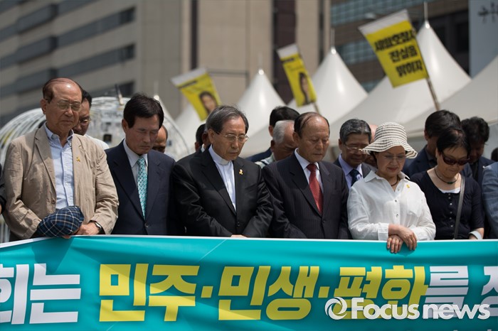 민주행동은 이날 6·10 선언문을 낭독하고 "20대 국회가 일을 제대로 수행할 수 있도록 열렬한 지지를 보내겠다"고 결의하는 한편 "만약 민심을 거스르는 방향으로 나아간다면 시민사회의 역량을 모아 저항하겠다"는 뜻을 분명히 했다.(서울=포커스뉴스) 10일 오전 서울 종로구 광화문 광장에서 민주주의국민행동 단체 회원들이 6.10 민주항생 29주년 관련 기자회견 전 묵념을 하고 있다. 2016.06.10 허란 기자