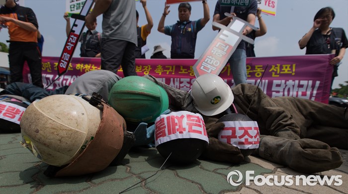 (서울=포커스뉴스) 8일 오전 서울 여의도 국회 앞에서 민주노총 금속노조 조합원들와 조선소 하청업체 직원들이 구조조정 중단과 고용안전 대책을 요구하는 퍼포먼스를 하고 있다.