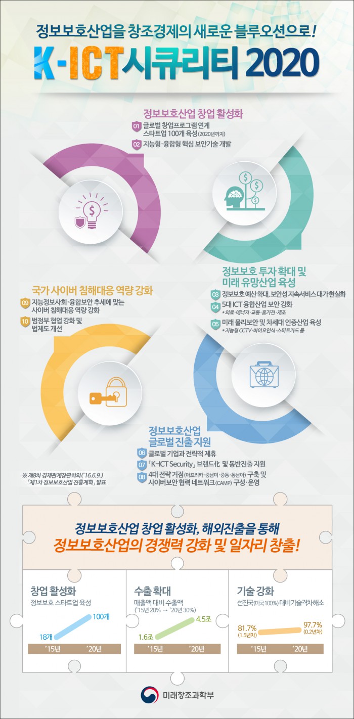 미래부는 이번 진흥계획을 통해 2020년까지 정보보호 창업기업 100개, 글로벌 강소기업 10개를 육성하는 한편, 현재 1조6000억원 규모인 정보보호 수출규모를 4조5000억원으로 확대할 전망이다.