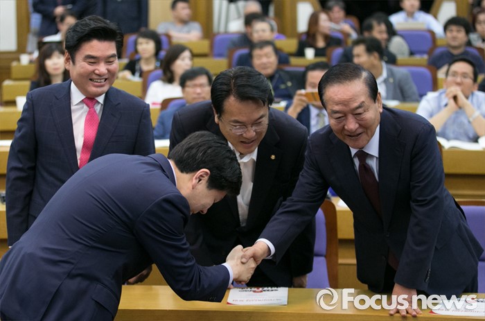 (서울=포커스뉴스) 8일 오전 서울 여의도 국회 의원회관에서 열린 국가미래전략포럼(일명 알파포럼) 창립총회 및 강연회에 참석한 서청원(오른쪽부터) 새누리당 전 최고위원, 정진석 원내대표, 원유철 전 원내대표가 의원들과 인사하고 있다.