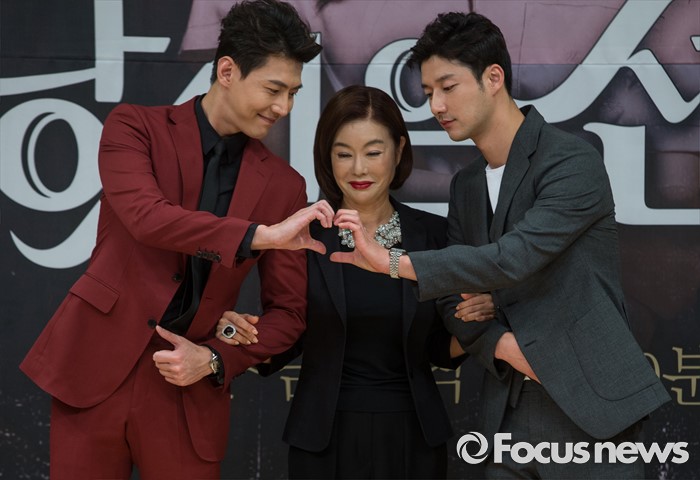 (서울=포커스뉴스) 8일 오후 서울 양천구 SBS 목동사옥에서 열린 SBS 일일드라마 '당신은 선물' 제작발표회에 참석한 배우 송재희(왼쪽부터), 김청, 차도진이 포토타임을 갖고 있다.
