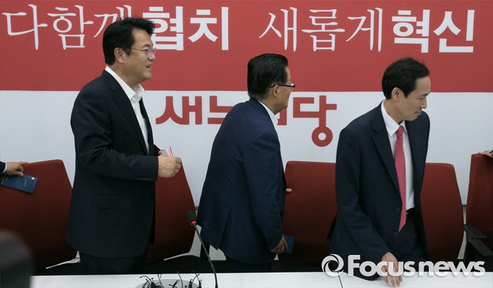 (서울=포커스뉴스) 8일 오후 서울 여의도 국회 새누리당 원내대표실에서 20대 국회 원구성 협상 등을 위한 3당 원내지도부 회동에 참석한 의원들이 합의문 작성을 위해 자리를 옮기고 있다. 이날 여야 3당은 20대 국회 원구성에 합의했다. 왼쪽부터 정진석 새누리당 원내대표, 박지원 국민의당 원내대표, 우상호 더불어민주당 원내대표.