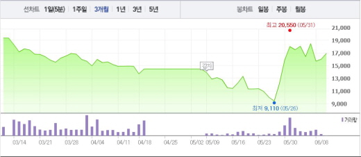 현대상선은 해외 선주 22곳과 용선료를 21% 가량 낮추기로 합의하고 이 결과를 이날 발표할 예정이다. 이 협상을 통해 용선료는 연간 약 1500억원 줄어드는 것으로 알려졌다.주가흐름<사진출처=네이버 캡쳐>