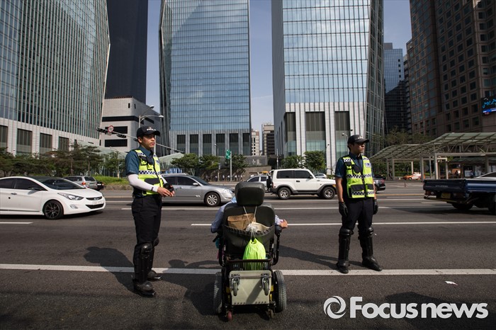 (서울=포커스뉴스) 8일 오후 서울 영등포구 여의도 환승센터 앞에서 경기장애인차별철폐공동투쟁단원들이 장애인 이동권 보장을 촉구하며 경기도행 버스를 막아서고 구호를 외치고 있다.