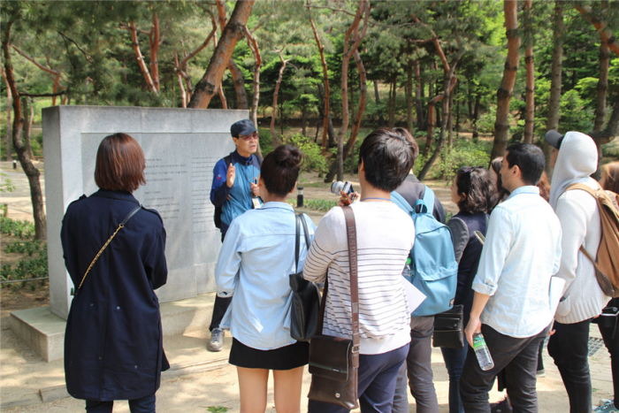 주한외국인 유네스코 문화유산 탐방 프로그램은 10월까지 총 6회에 걸쳐 진행된다. 각 행사의 대상과 탐방 장소, 일정 공고 등은 유네스코세계문화유산 탐방 홈페이지와 페이스북을 통해 별도 공지된다.지난해 종묘 제례 감상 및 선정릉 세계문화유산 체험 행사에서 영어 문화해설사가 설명하고 있는 모습. <사진제공=문화체육관광부>