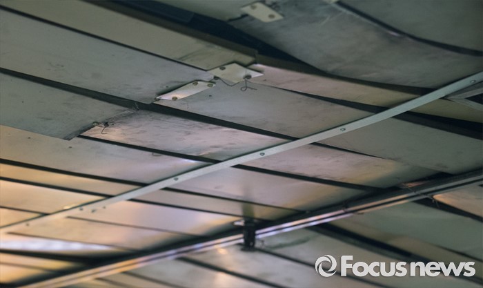 (서울=포커스뉴스) 9일 오전 서울 지하철 종로5가역 지하상가와 출입구를 연결하는 통로의 천장이 훼손돼 임시방편으로 철제 구조물로 조치 되어 있다. 플라스틱 소재로 마감된 천장은 움푹 패어있었으며 휘어지거나 깨진 곳도 많아 위태로워 보인다.