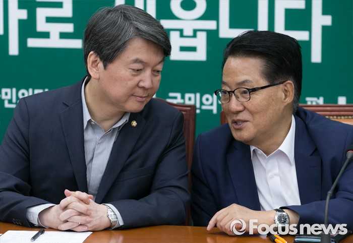 (서울=포커스뉴스) 8일 오전 서울 여의도 국회에서 열린 국민의당 최고위원회의에 참석한 안철수(왼쪽) 상임공동대표와 박지원 원내대표가 대화하고 있다.
