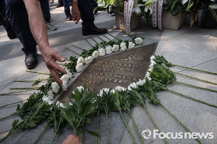 (서울=포커스뉴스) 9일 오후 서울 서대문구 연세대학교 정문 앞에서 열린 '제29주기 이한열 열사 동판 제막식에 참석한 시민들이 고인의 동판에 헌화하고 있다.