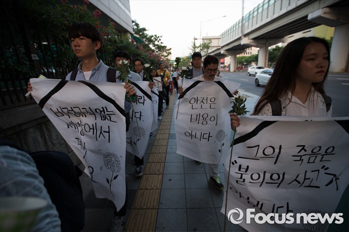 (서울=포커스뉴스) 지난달 28일 서울 지하철 2호선 구의역에서 스크린도어 정비 도중 숨진 김 모씨의 발인을 하루 앞둔 8일 오후 서울 광진구 지하철 2호선 구의역 인근에서 시민들이 김 모씨를 추모하며 행진하고 있다.