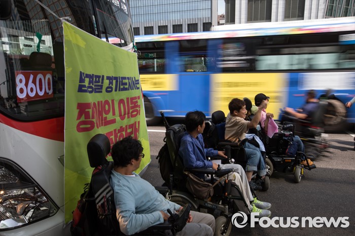 (서울=포커스뉴스) 8일 오후 서울 영등포구 여의도 환승센터 앞에서 경기장애인차별철폐공동투쟁단원들이 장애인 이동권 보장을 촉구하며 경기도행 버스를 막아서고 구호를 외치고 있다.