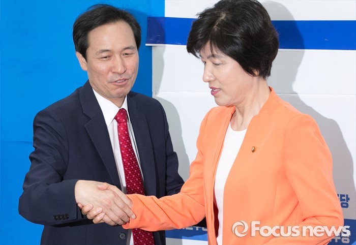 (서울=포커스뉴스) 9일 오전 서울 여의도 국회에서 열린 더불어민주당 가계부채TF, 현황 및 정부대책 보고에 참석한 우상호(왼쪽) 원내대표와 김영주 TF 위원장이 인사하고 있다.