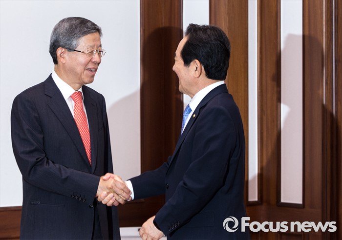(서울=포커스뉴스) 정세균(오른쪽) 국회의장이 10일 오후 서울 여의도 국회에서 김희옥 새누리당 혁신비상대책위원회 위원장과 면담에 앞서 악수 하고 있다.