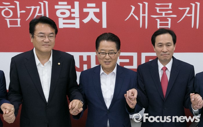 (서울=포커스뉴스) 8일 오후 서울 여의도 국회 새누리당 원내대표실에서 20대 국회 원구성 협상 등을 위한 3당 원내지도부 회동에 참석한 의원들이 포즈를 취하고 있다. 왼쪽부터 정진석 새누리당 원내대표, 박지원 국민의당 원내대표, 우상호 더불어민주당 원내대표.