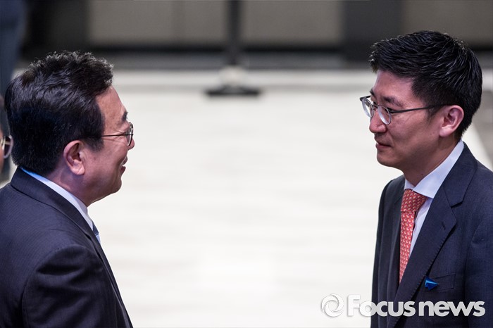 (서울=포커스뉴스) 새누리당 부산시 당 위원장인 김세연(오른쪽) 의원과 서병수 부산광역시장이 8일 오전 서울 여의도 켄싱턴호텔에서 열린 '새누리당 부산시당-부산광역시 당정 협의'에 참석해 대화를 나누고 있다.