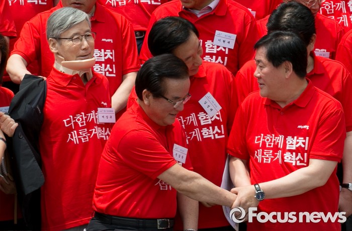 (과천=포커스뉴스) 10일 오전 경기도 과천 국가공무원인재개발원에서 열린 2016 새누리당 정책워크숍에 참석한 최경환, 정갑윤 의원이 인사하고 있다.