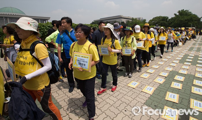 (서울=포커스뉴스) 8일 오전 서울 여의도 국회 앞에서 4.16가족협의회와 4.16연대 관계자들이 세월호 진상규명 특별법 개정 입법청원 기자회견 후 입법청원서를 들고 국회 본청 앞으로 향하고 있다.