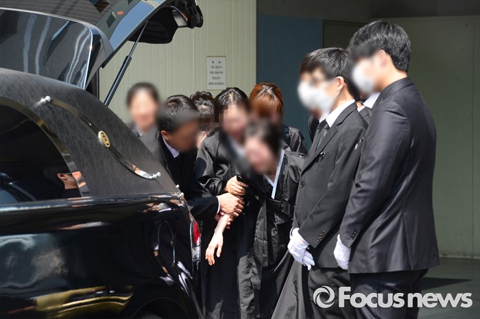 (서울=포커스뉴스) 서울 지하철 2호선 구의역에서 스크린도어를 정비하다가 숨진 김 모 군의 발인일인 9일 오전 서울 광진구 건국대학교병원 장례식장에서 김군의 유족들이 시신이 영구차에 실리는 것을 보고 슬퍼하고 있다.